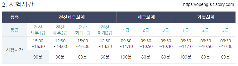 보시다시피 세무회계는 급수와 관계없이 모두 오전 9시 30분에 시작해서 10:30분에 종료됩니다.