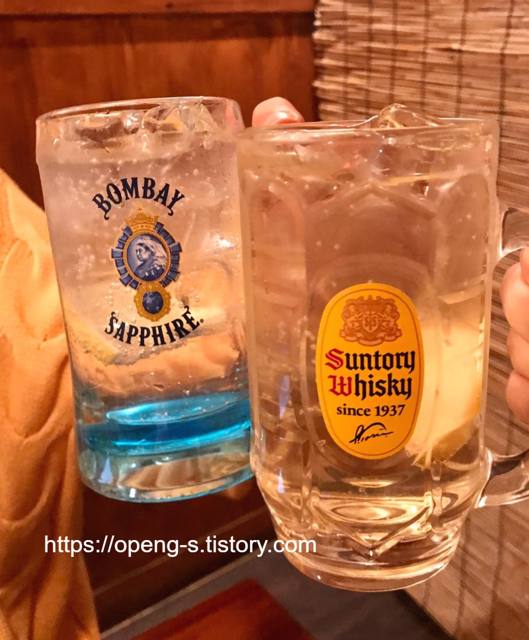 좌측 파란색 잔은 봄베이 하이볼